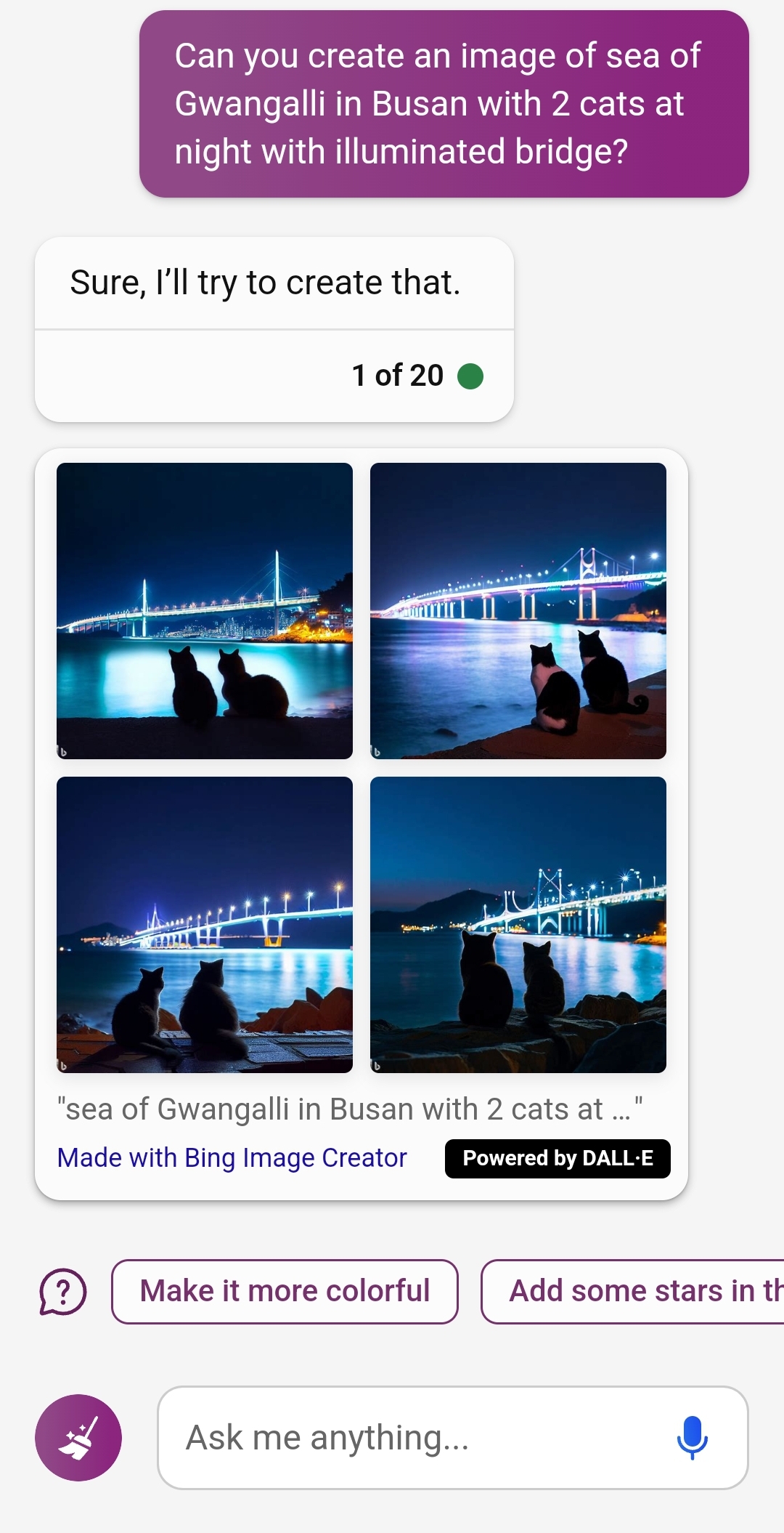 "조명으로 다리가 빛나는 광안리 밤바다에 고양이 2마리를 함께 그려줘"가 프롬프트가 되겠네요.